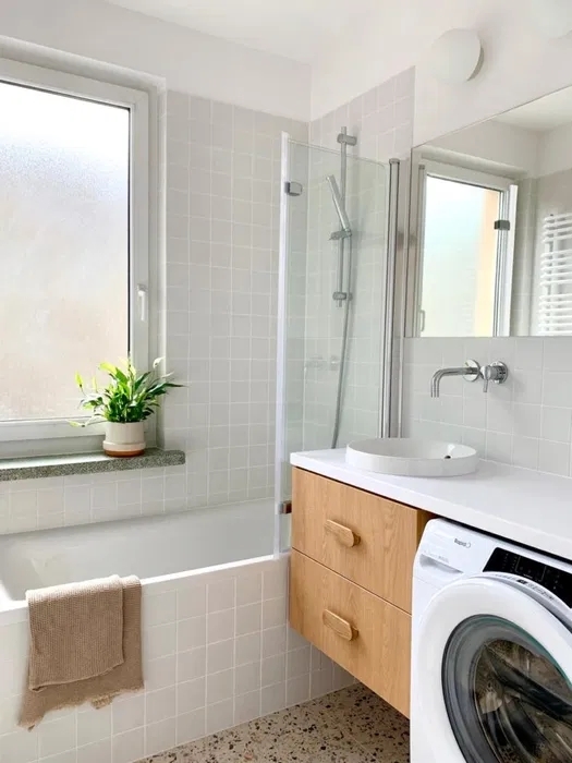 Łazienka z wanną z osłoną prysznicową, umywalką; pralka