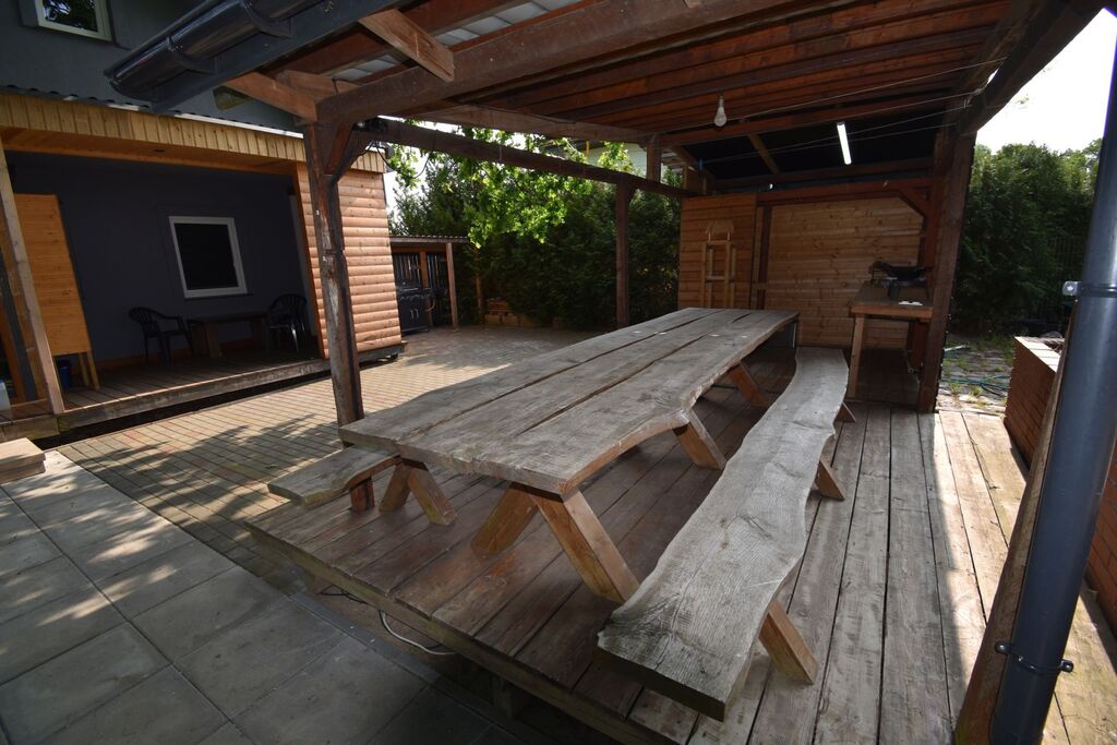 stołem biesiadnym oraz schowkiem na sprzęt i rowery.