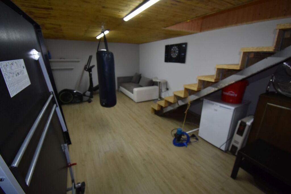 Piwnica/schron żelbetowa, rekreacyjna około 30m2, w której umiejscowiony jest własny pobór wody-studnia głębinowa, przyłącza do instalacji kominka. Rekreacja (stół do ping-ponga, dart, orbitrek, ławeczka, możliwa siłownia).