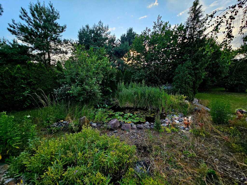Nieruchomość usytuowana na działce z basenem, zaaranżowanym ogrodem oraz oczkiem wodnym, licznymi nasadzeniami.