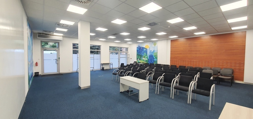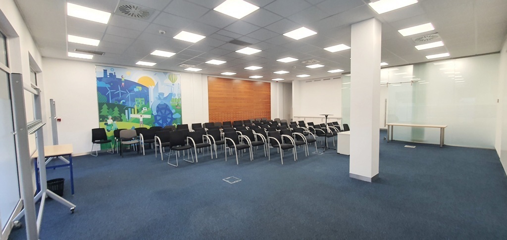 Na podłodze wysokiej jakości kafle, w kilku miejscach pod kaflami miejsca do przyłączenia komputerów, telefonów, prądu – tzw. floorboxy. Ściany gładzone i malowane, sufit podwieszony z klimatyzacją. Na suficie nowoczesne oświetleni punktowe.