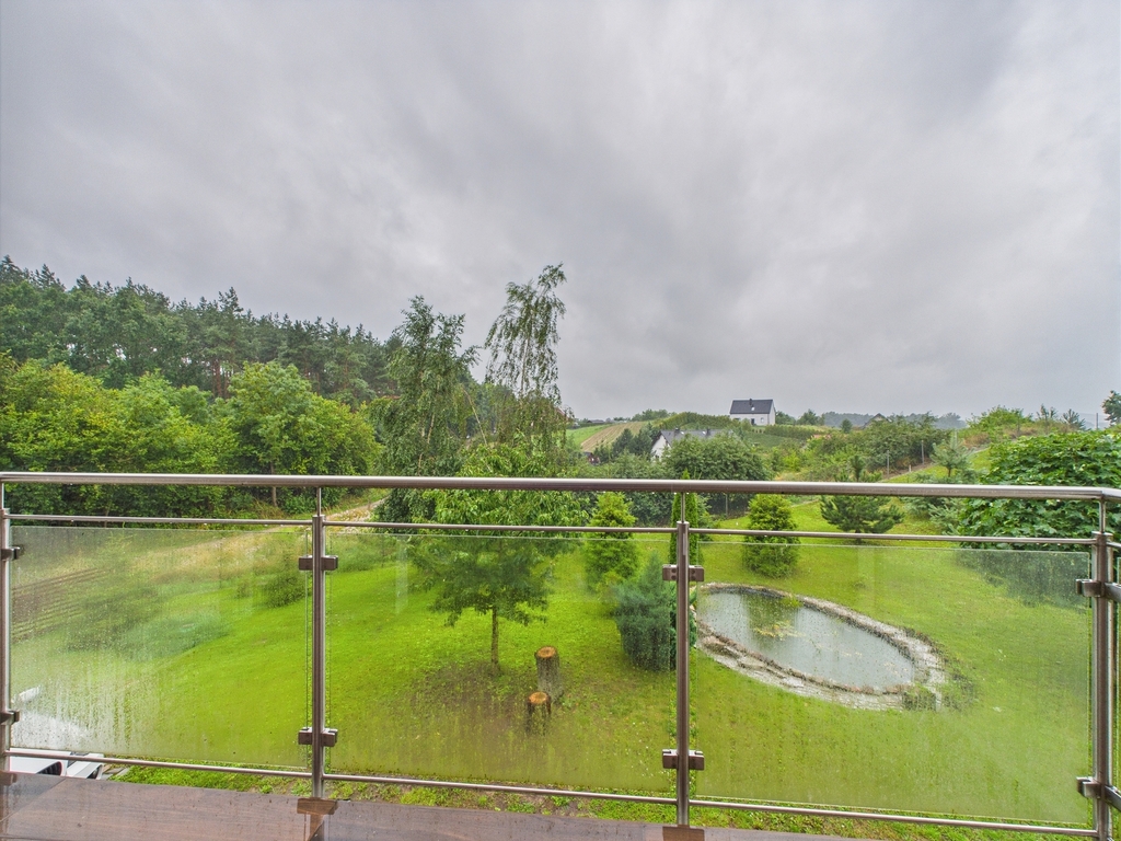 Przed domem wita nas duża brama wjazdowa, za nią znajduje się plac wyłożony kamieniem. Z kolei już na terenie zielonym mieści się drewutnia, oraz oczko wodne.