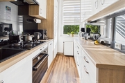 Kuchni (9,4 m²) – nowoczesna, w pełni wyposażona w zabudowę i sprzęt AGD, z widokiem na zieleń za oknem,