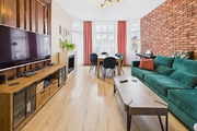 Do mieszkania przynależy balkon z ekspozycją południową – z pięknie ukwieconym parapetem, idealny na poranną kawę. Całość utrzymana jest w spójnym, estetycznym stylu – z dużą dbałością o detale i funkcjonalność. Wnętrza łączą klasyczny charakter kamienicy z nowoczesnym komfortem.