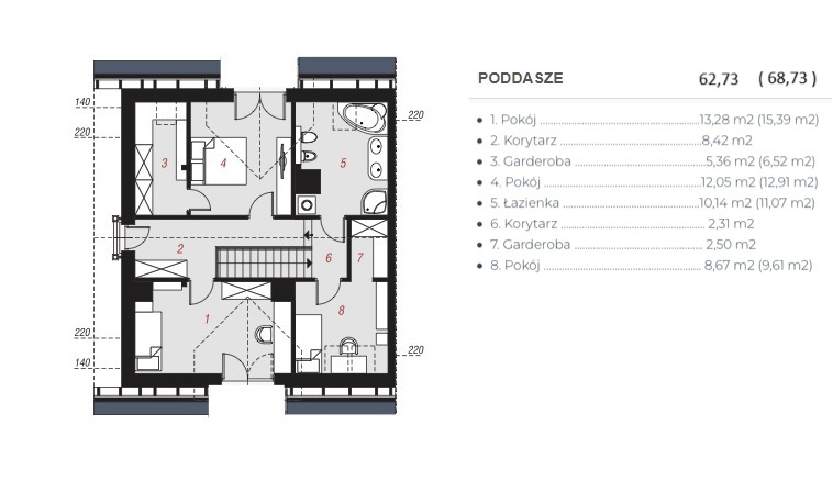 Piętro: pow. użytkowa 62,73m2 (powierzchnia po podłodze 68,73m2 ) :