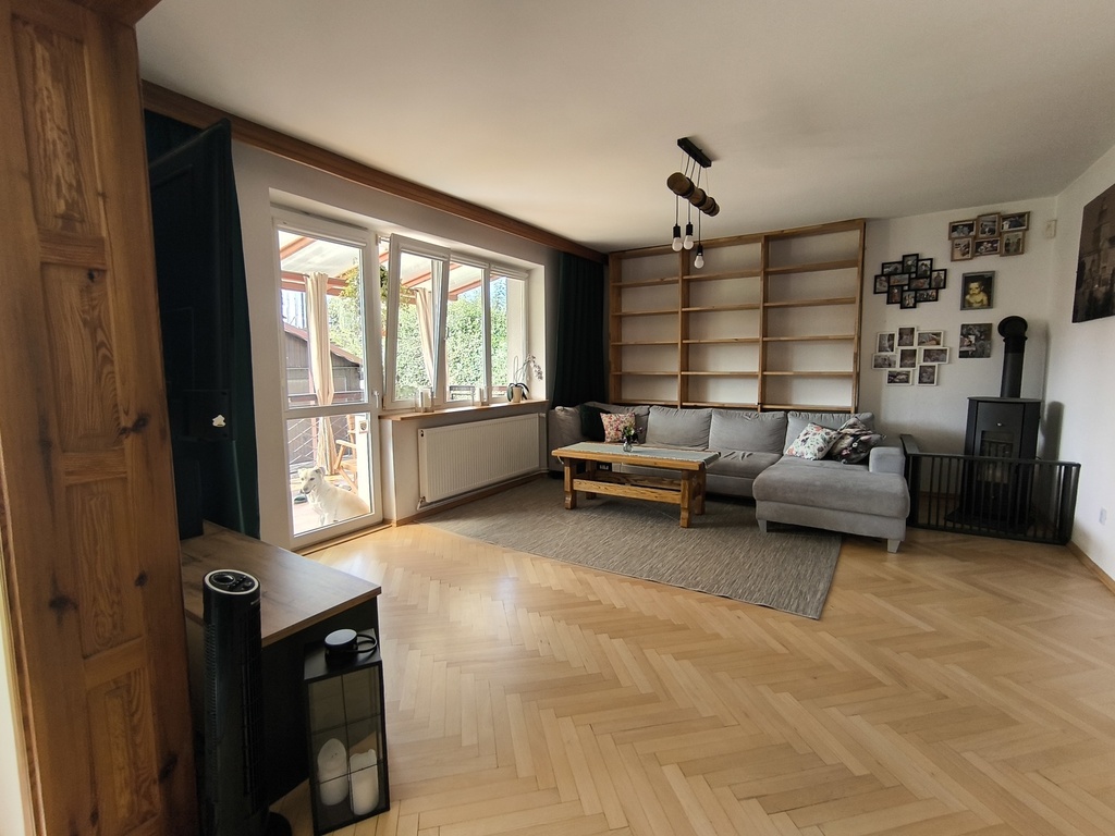 Salon (22 m²) – jasny i przytulny, z kominkiem, dębowym parkietem i wyjściem na taras
