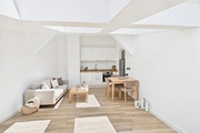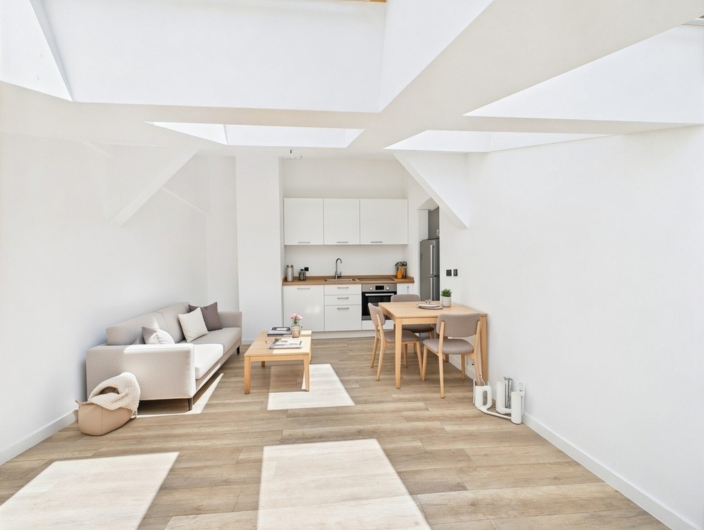 • widok na dachy kamienic i niebo, który daje fajne poczucie przestrzeni