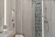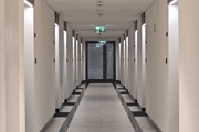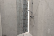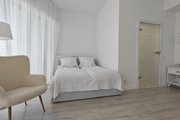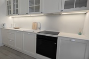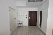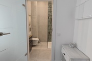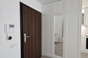 W salonie po lewej stronie część wypoczynkowa (stolik kawowy z krzesłami i komodą ) zaś prawą stronę zagospodarowano na część sypialnianą z nowym łóżkiem 1,60m x 2m (istnieje możliwość podzielenia salonu na dwa mniejsze pokoje). W pokoju, kuchni i holu – nowe panele na podłodze, ściany gładzone i pomalowane na biało. Między kuchnią a salonem znajduje się mini wyspa z dwoma hokerami. W kuchni pozostaje umeblowanie wykonane przez stolarza plus sprzęt AGD w zabudowie (piekarnik elektryczny, płyta grzewcza indukcyjna, zmywarka – wszystko firmy Samsung oraz mała lodówka). W łazience nowoczesny gres na podłodze i ścianach plus przeszklona kabina prysznicowa, umywalka z szafką, podwieszana muszla oraz grzejnik drabinkowy. Dodatkowo w łazience szklane drzwi wejściowe. Kuchnia oddzielona od holu trzyczęściową szafą.