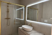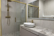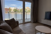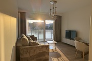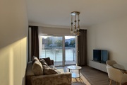 Powierzchnia obejmuje przestronny salon z aneksem kuchennym, sypialnię, elegancką łazienkę oraz duży balkon z panoramicznym widokiem na rzekę. Wnętrza zaprojektowane w spójnym, eleganckim stylu – złote detale, nowoczesne oświetlenie, wysokiej jakości materiały wykończeniowe oraz pełne wyposażenie AGD (w tym piekarnik, płyta indukcyjna, lodówka, zmywarka).