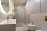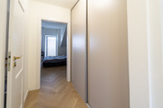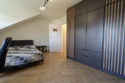 Trzy ustawne sypialnie zapewniają przestrzeń zarówno dla domowników, jak i gości. Dwie łazienki – jedna z wanną, druga z prysznicem – zostały zaprojektowane z myślą o codziennej wygodzie. Całość dopełnia podłoga w klasyczną jodełkę, nadająca wnętrzom ponadczasowego charakteru.