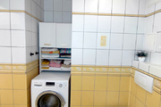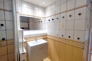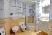 W łazience prysznic, toaleta, bidet oraz wydzielone miejsce na pralkę.