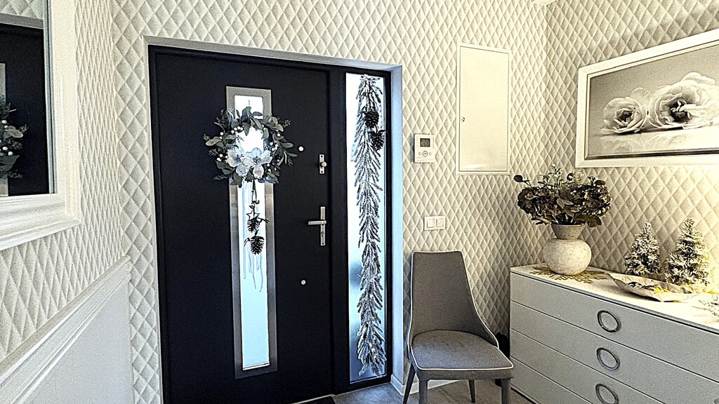 W każdej sypialni zainstalowano klimatyzację z funkcją sterowania przez Wi-Fi. Na tarasie znajduje się automatyczna markiza. Okna wyposażono w rolety antywłamaniowe sterowane pilotem.
