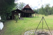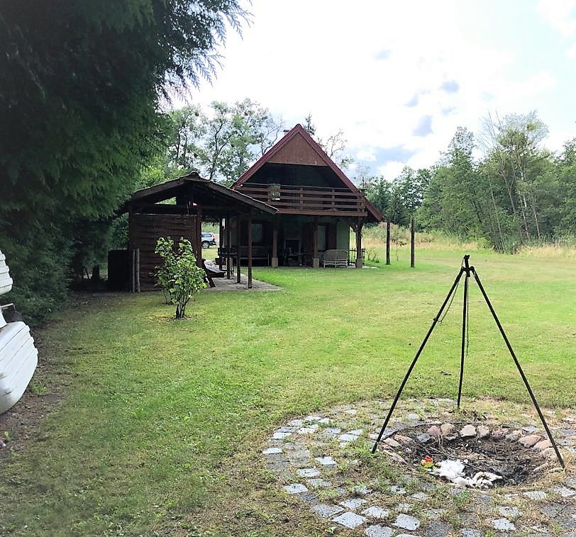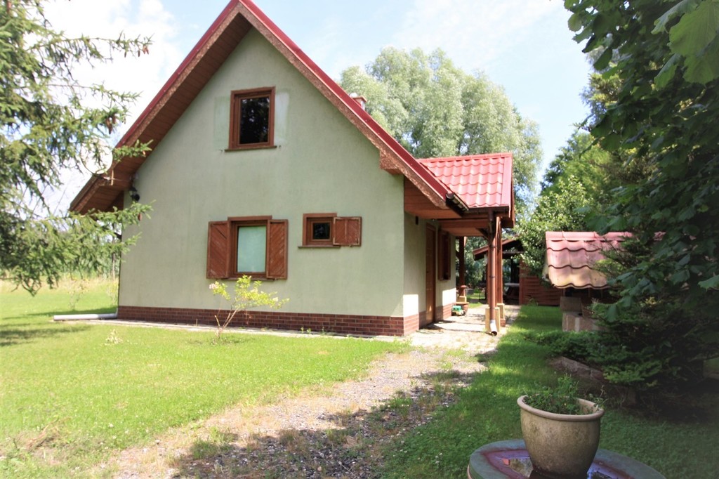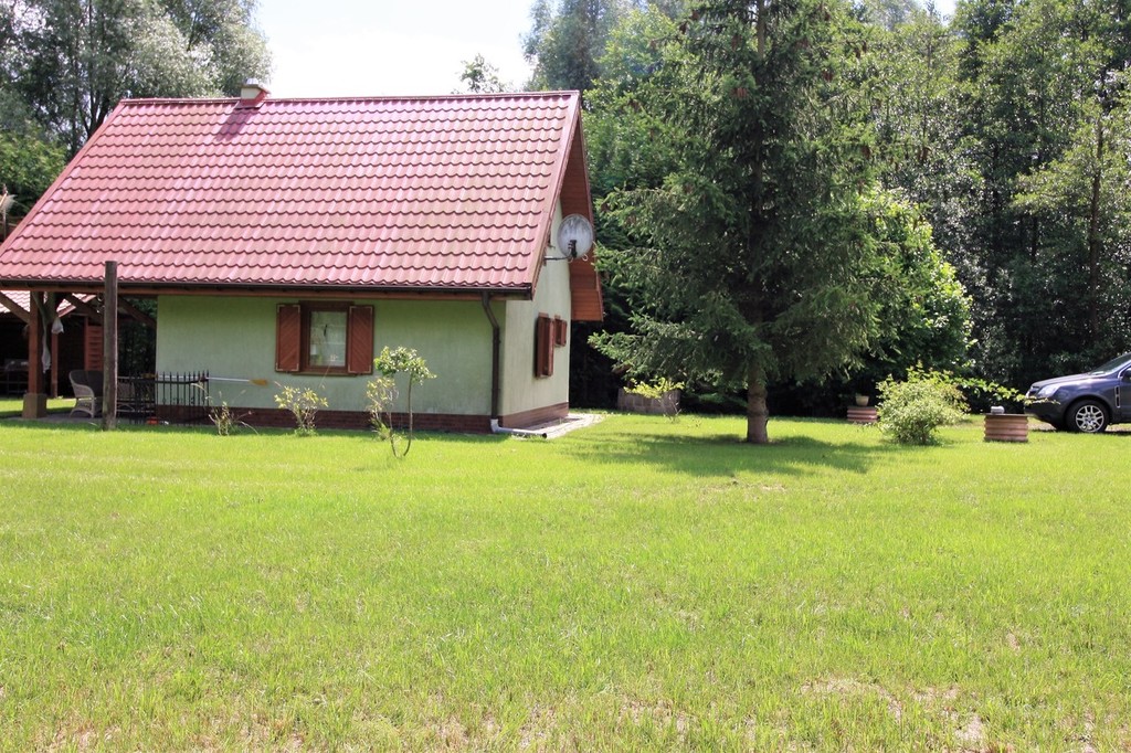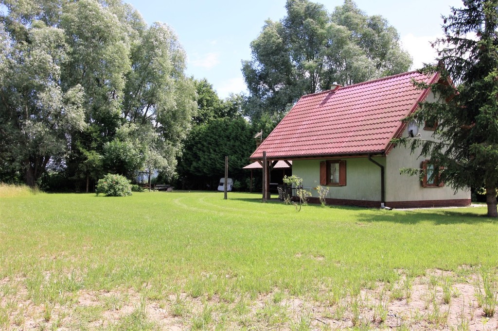 Na działce znajduje się całoroczny domek letniskowy o podstawie 35 m², ogrzewany wydajną kozą norweską, co zapewnia komfort wypoczynku przez cały rok.