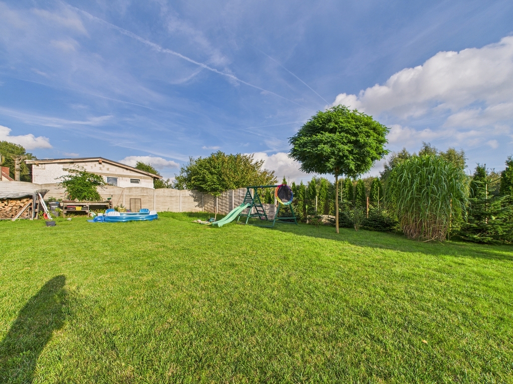 Duża, zadbana działka 1823 m² – perfekcyjne miejsce na relaks, zabawy dzieci i spotkania rodzinne.