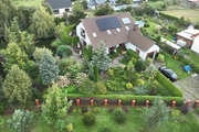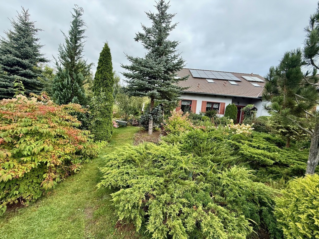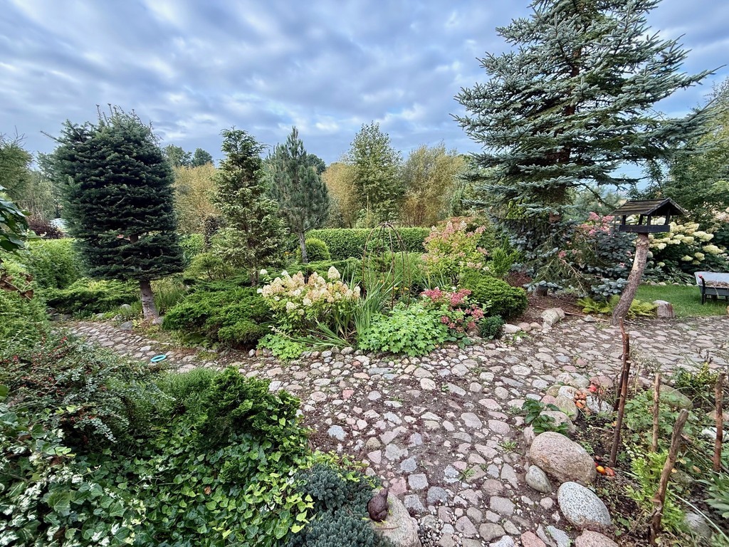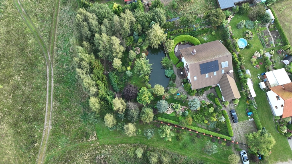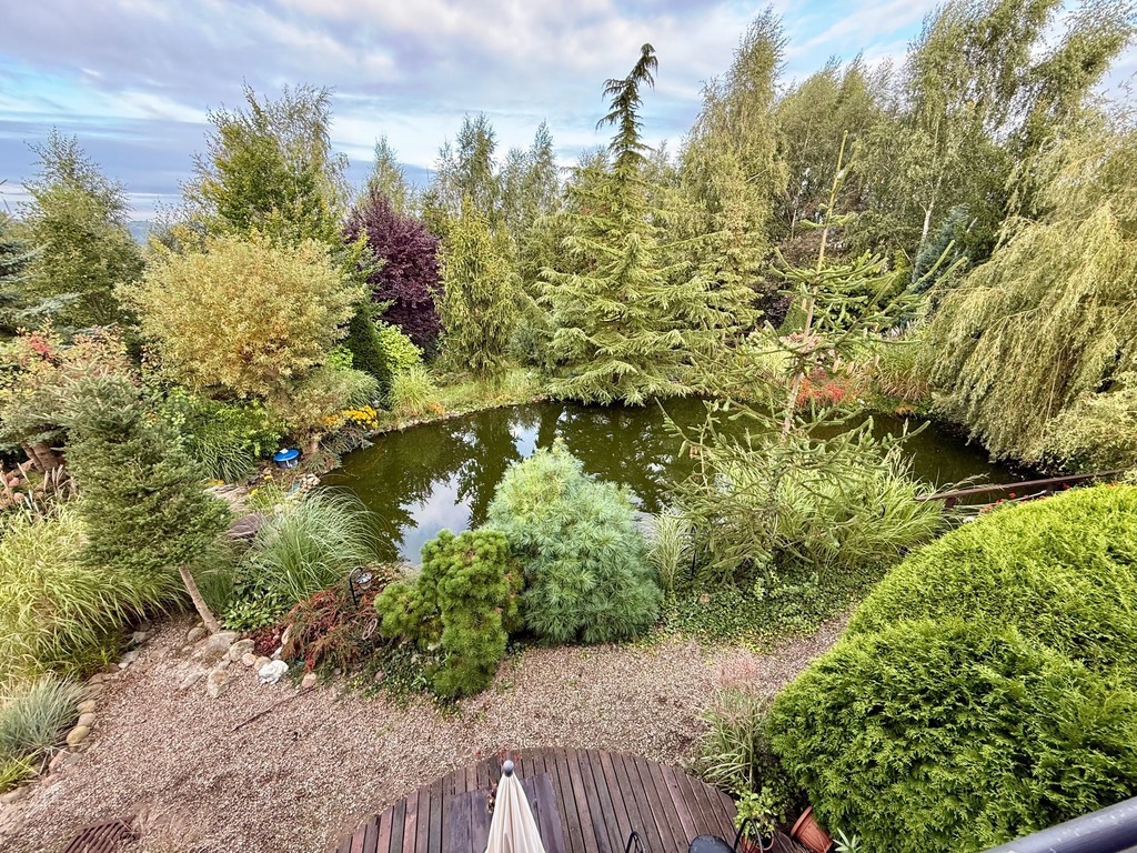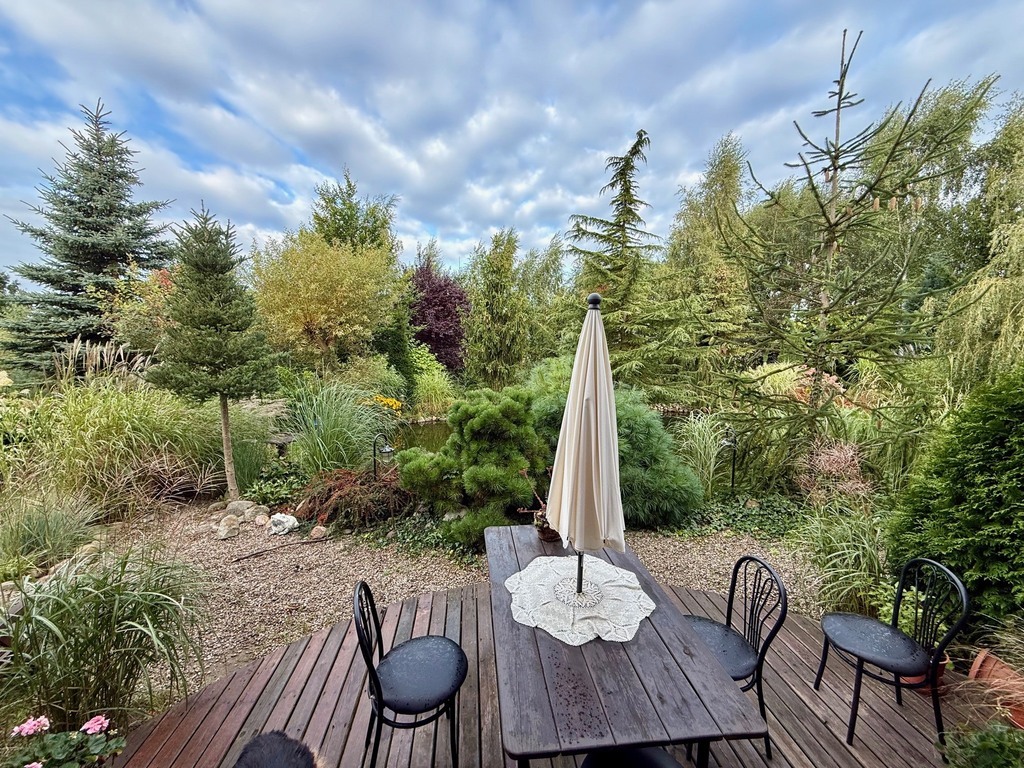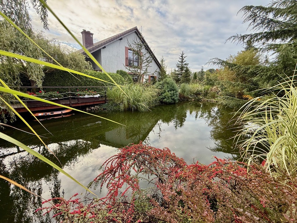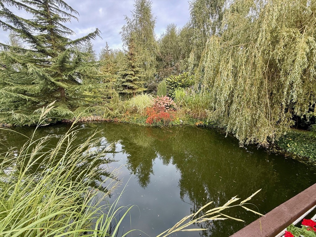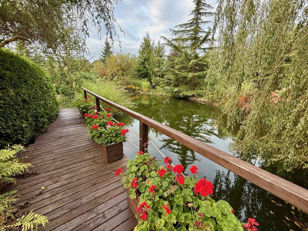 Ogród: Działka o powierzchni 1946 m² jest pięknie zagospodarowana – znajdziesz tu mnóstwo roślin ozdobnych, drzewa, krzewy oraz duży staw z pomostem, który nadaje posesji niepowtarzalnego klimatu. Idealne miejsce na relaks lub poranną kawę przy śpiewie ptaków.
