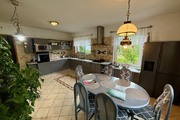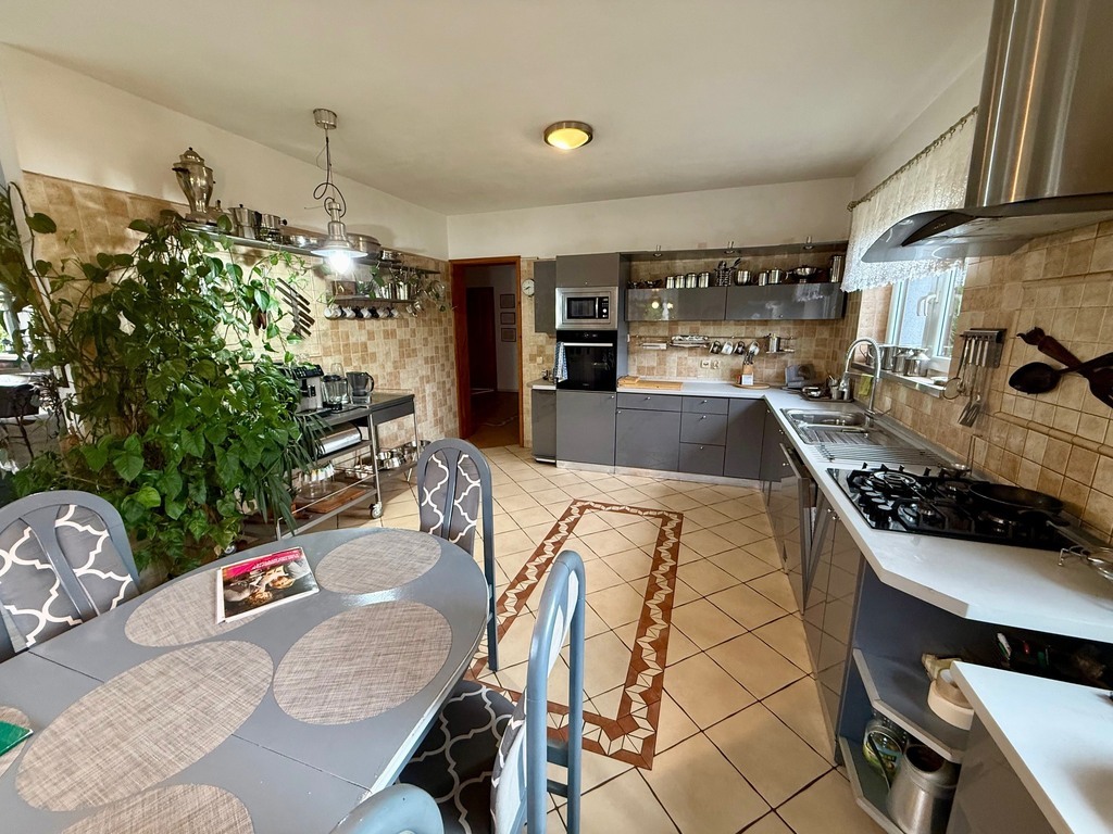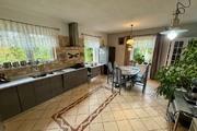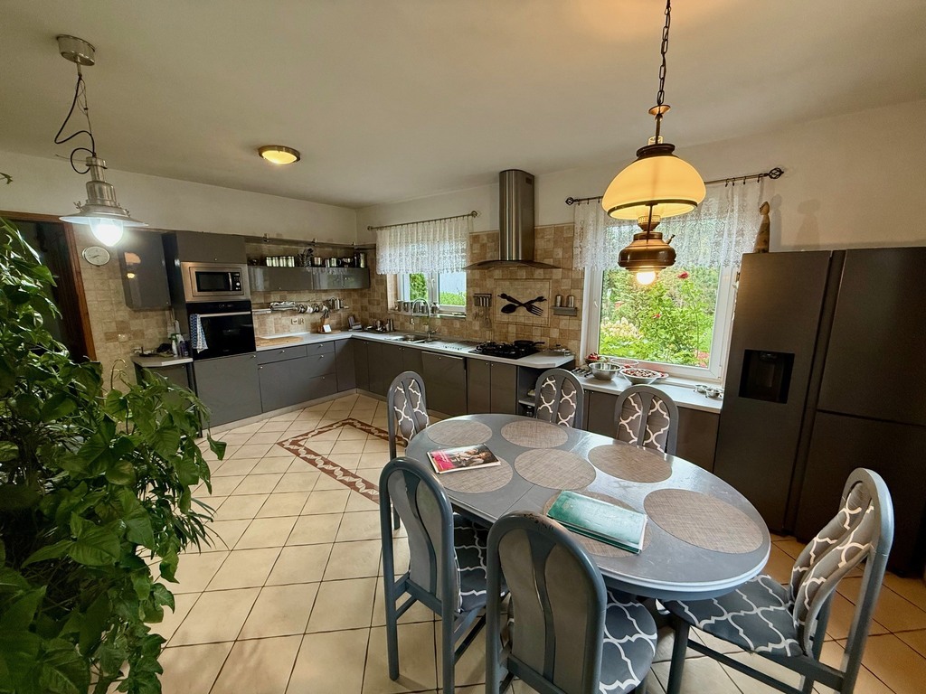 Dom został zaprojektowany z myślą o wygodzie i funkcjonalności. Na parterze znajduje się przestronna, jasna kuchnia z częścią jadalnianą, nowoczesnym sprzętem AGD i dużą ilością miejsca do przechowywania. Tuż obok znajduje się salon z kominkiem, wyjściem na taras i pięknym widokiem na ogród oraz staw.