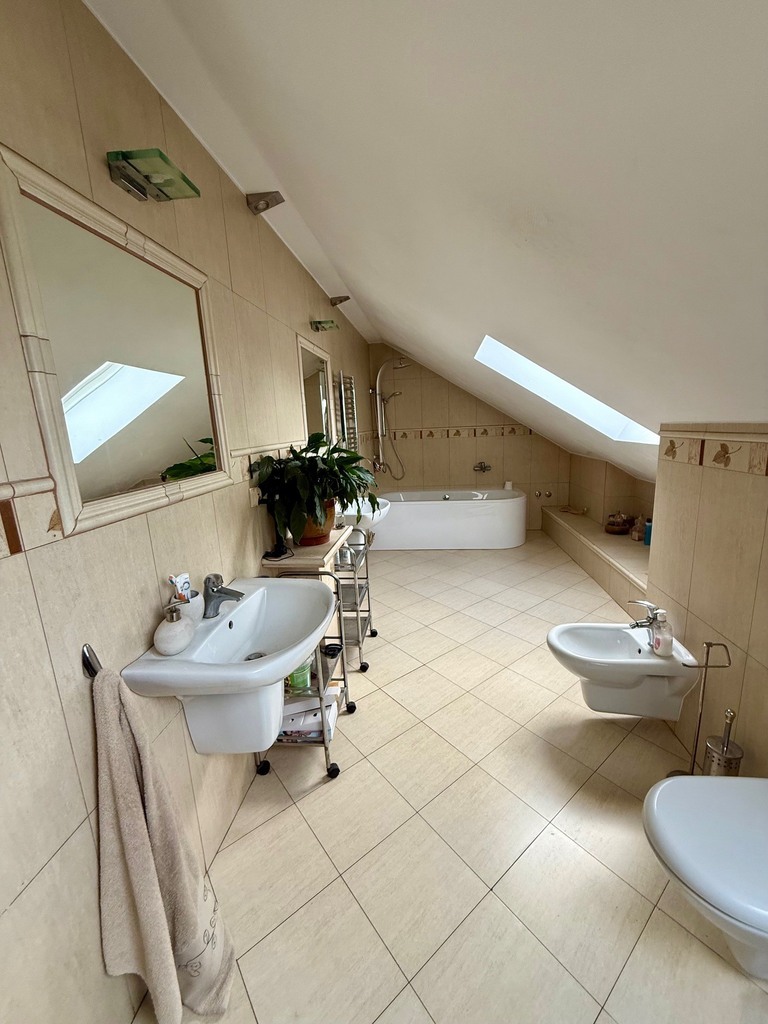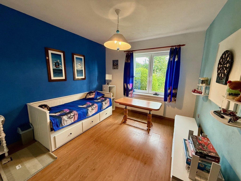 Na parterze znajdziesz także pierwszą łazienkę oraz pomieszczenia gospodarcze. Na piętrze rozplanowano cztery sypialnie oraz drugą łazienkę.