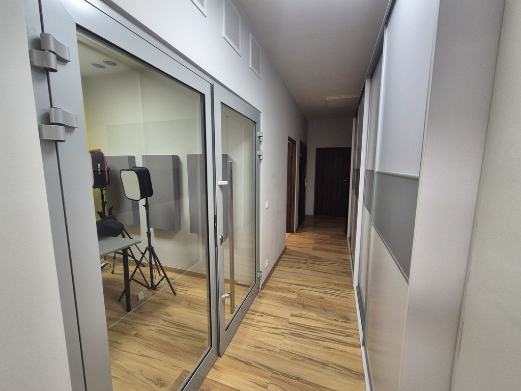Powierzchnia lokalu to ponad 112m2 i składają się na nią duża przestrzeń open space, 2 gabinety, zaplecze socjalne. Istnieje możliwość dostawienia ścianek działowych i wydzielenia dodatkowych pokoi.