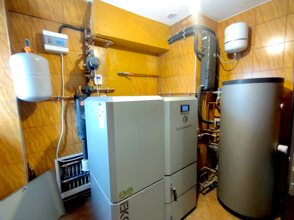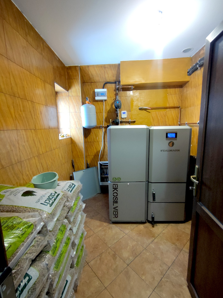 Ogrzewanie z nowoczesnego pieca na pelet z zasobnikiem (w pełni automatyczny).