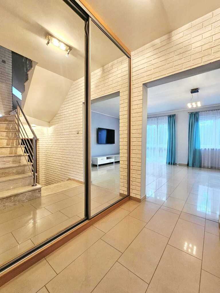 Na powierzchnię parteru budynku, pełniącego jednocześnie rolę strefy dziennej domu, składają się: kuchnia z jadalnią, przestronny salon z którego wychodzi się na taras oraz zaaranżowany ogród, łazienka z wc, pomieszczenie sanitarno – gospodarcze z bezpośrednim wejściem do garażu (2. stanowiskowy, z bramą otwieraną na pilota), korytarz i wiatrołap. Na piętro nieruchomości prowadzą piękne, marmurowe schody (Breccia). W górnej części domu, pełniącej głownie strefę nocną, stanowią 3. sypialnie, pokój wielofunkcyjny, główna łazienka z wc oraz korytarz.