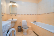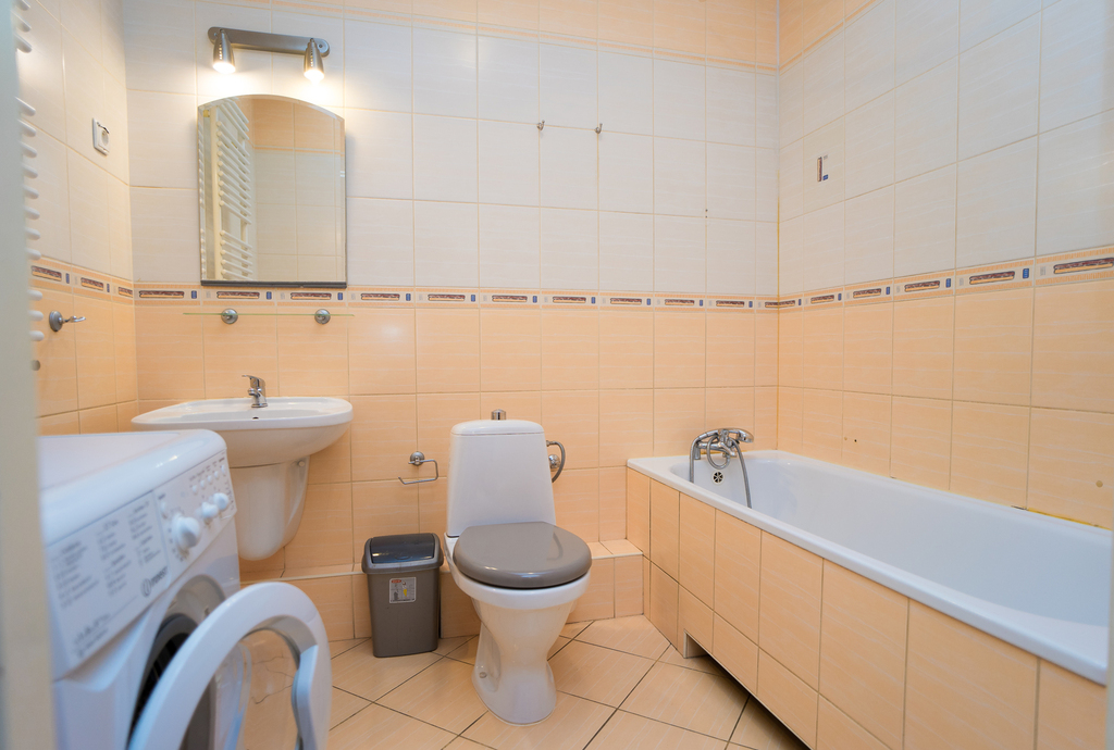 – łazienka z wanną, wc i pralką.