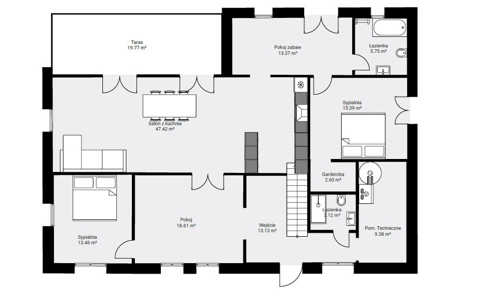 * 2 sypialnie (jedna garderobą) – 15,39 m2 oraz 13,46 m2