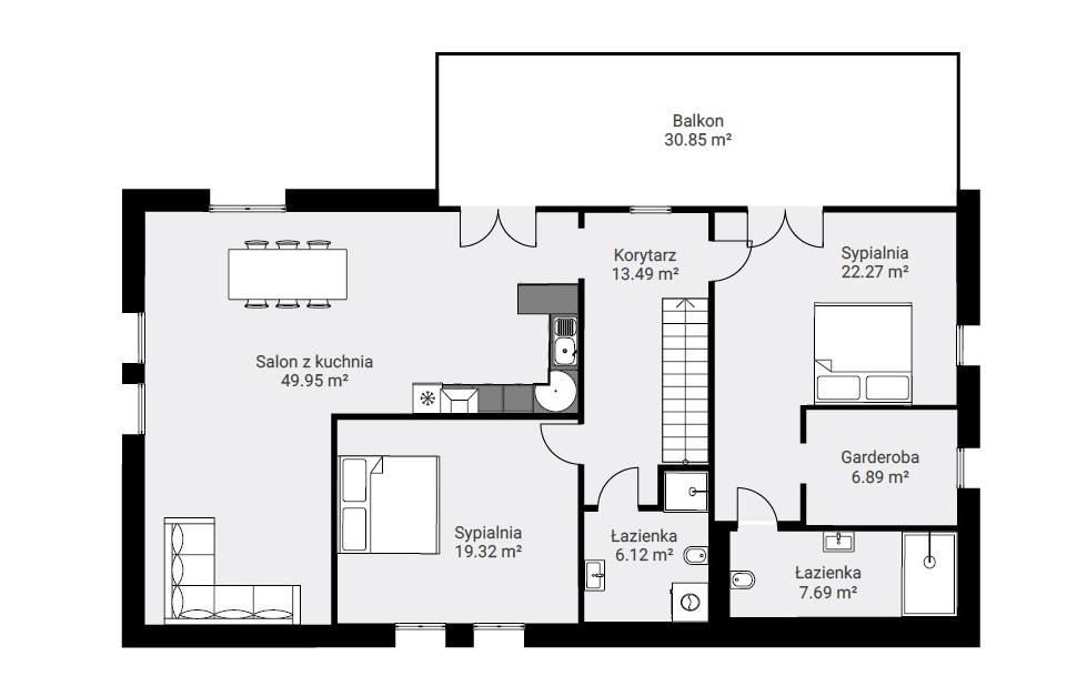 * Salon (z możliwością/miejscem na aneks kuchenny) – 49,95 m2