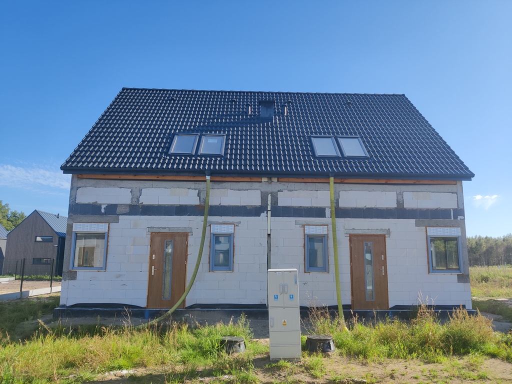 Dwa domy w zabudowie bliźniaczej, usytuowane na działce o powierzchni 600 m². Powierzchnia całkowita obu domów to 160 m2 ( 80 m2 każdy) plus 2 miejsca postojowe. Na parterze każdego z domów znajduje się salon z aneksem kuchennym o powierzchni 31,89 m2 z wyjściem na zadaszony taras, wc z kabiną prysznicową (3,12m2), korytarz (3,25m2) oraz powierzchnia pomocnicza (3,02m2). Na piętrze o powierzchni całkowitej 37,63m2 znajdują się 3 pokoje i łazienka.