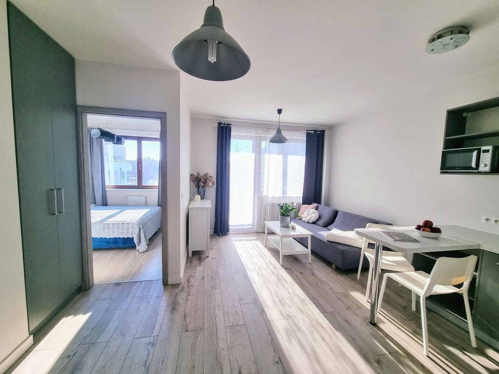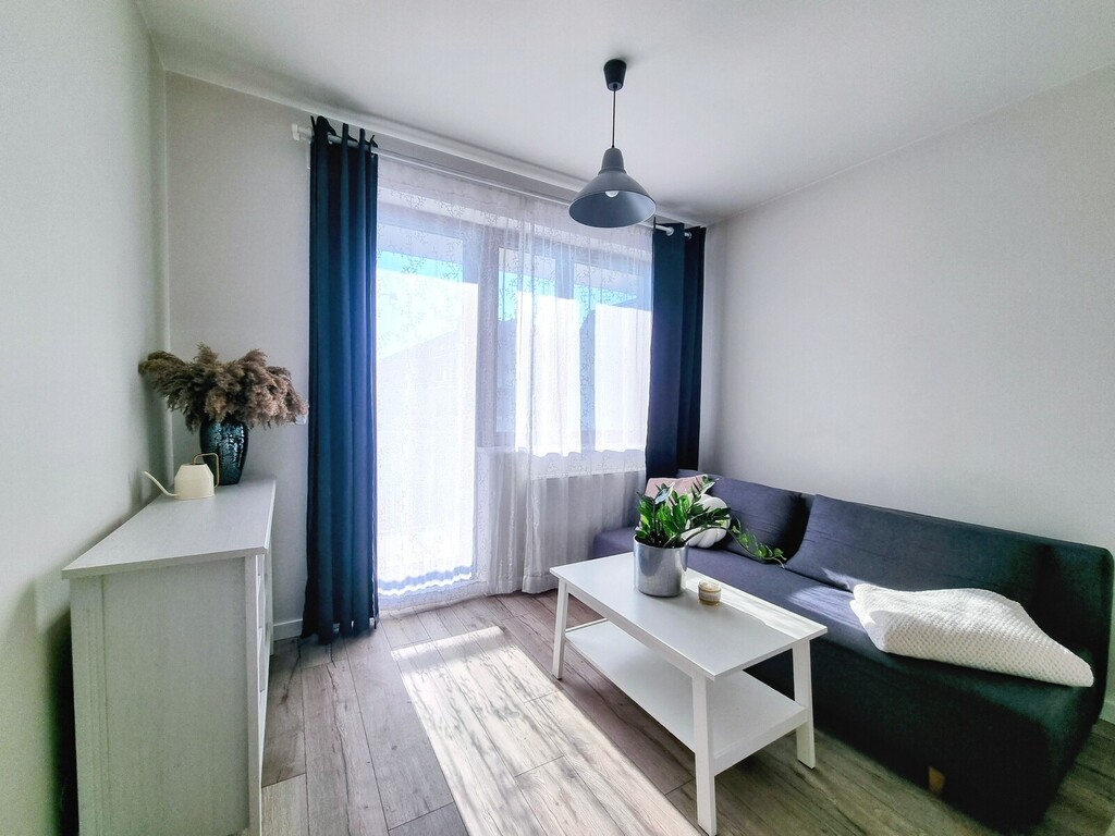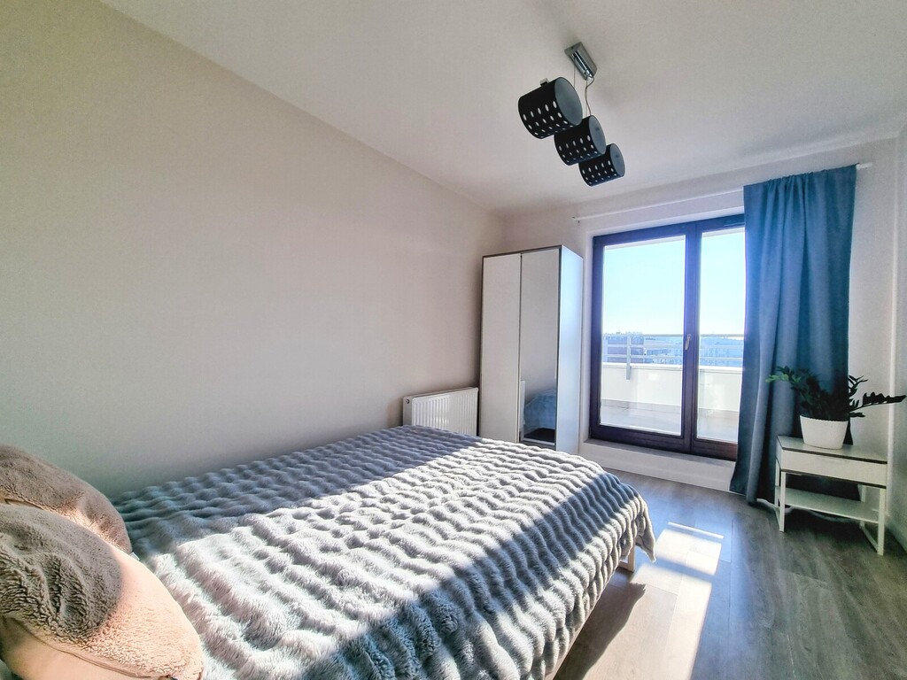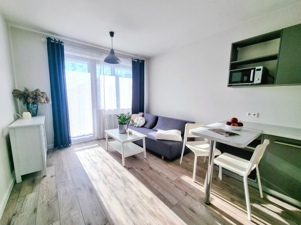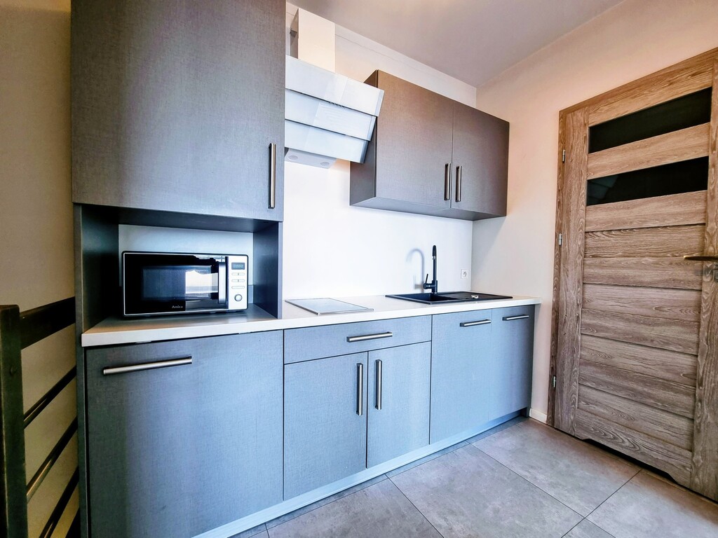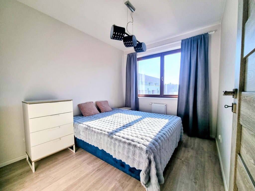 Kuchnia wyposażona w meble w zabudowie oraz sprzęt AGD: lodówka, płyta grzewcza, okap, zmywarka, mikrofalówka. W łazience: kabina prysznicowa, umywalka, toaleta, pralka. W pierwszym pokoju znajduje się w duże łóżko, szafa oraz stolik, w drugim pokoju rozkładana kanapa, stolik kawowy, komoda oraz regał i biurko. Z obu pokoi wyjście na duży taras, idealny do relaksu.