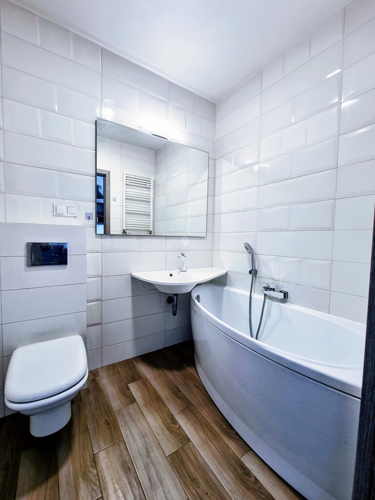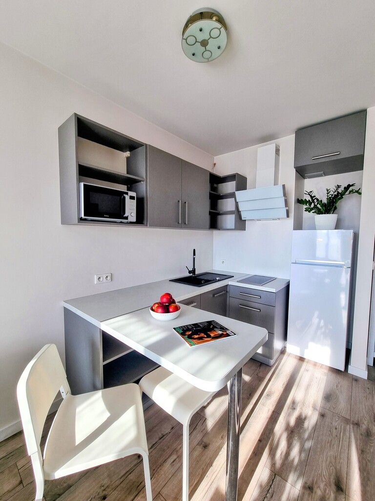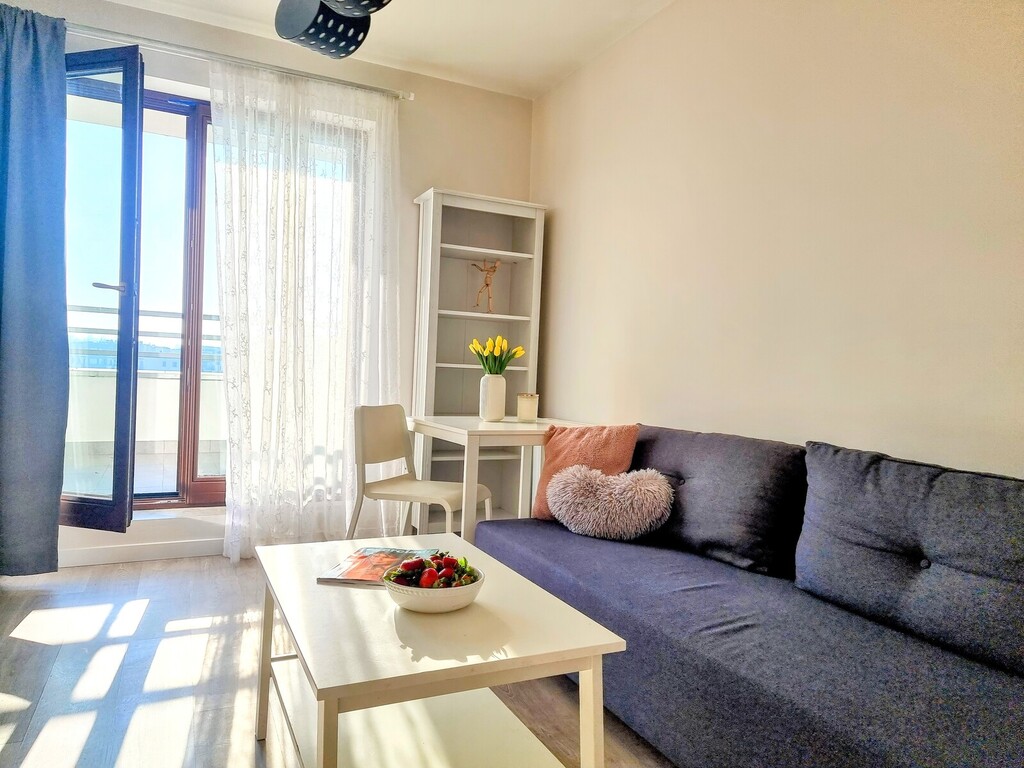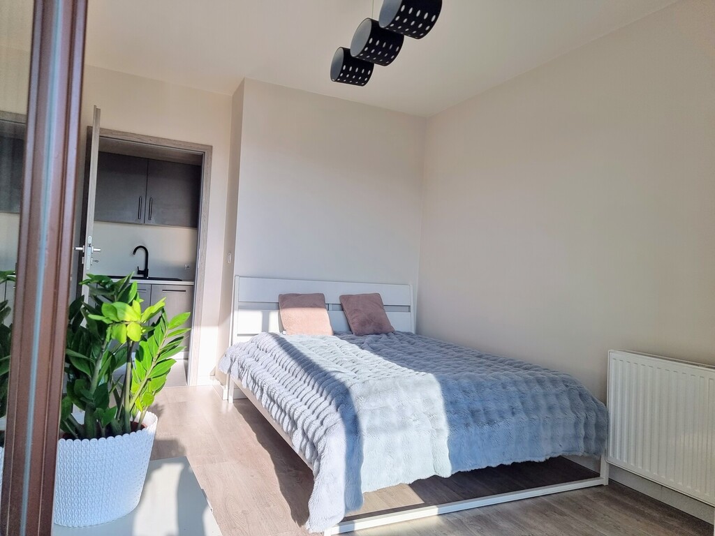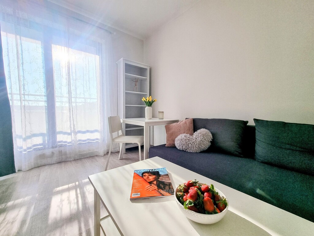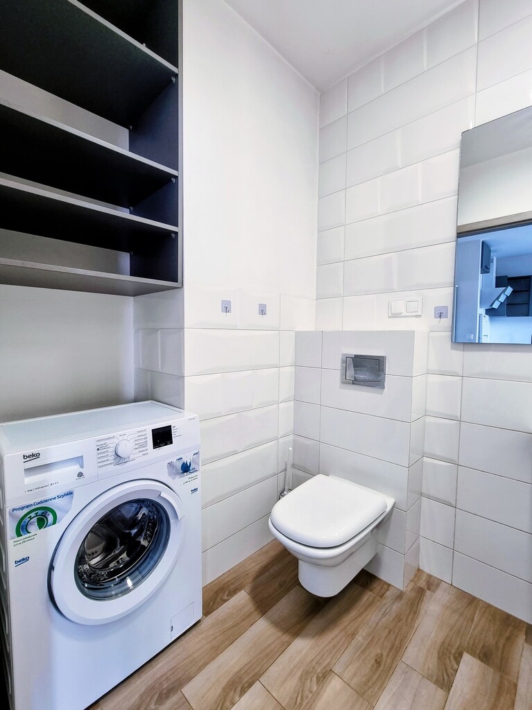 Kuchnia wyposażona w meble w zabudowie oraz sprzęt AGD: lodówka z zamrażalką, płyta grzewcza, okap, zmywarka, mikrofalówka. W łazience: narożna wanna, umywalka, toaleta, pralka. W sypialni znajduje się w duże łóżko, komodę oraz szafę w zabudowie. Salon mieści kanapę, stolik kawowy oraz stół z krzesłami. Z salonu również wyjście na balkon. Dodatkowo do dyspozycji są dwie szafy – jedna przy salonie, druga we wspólnym przedpokoju.