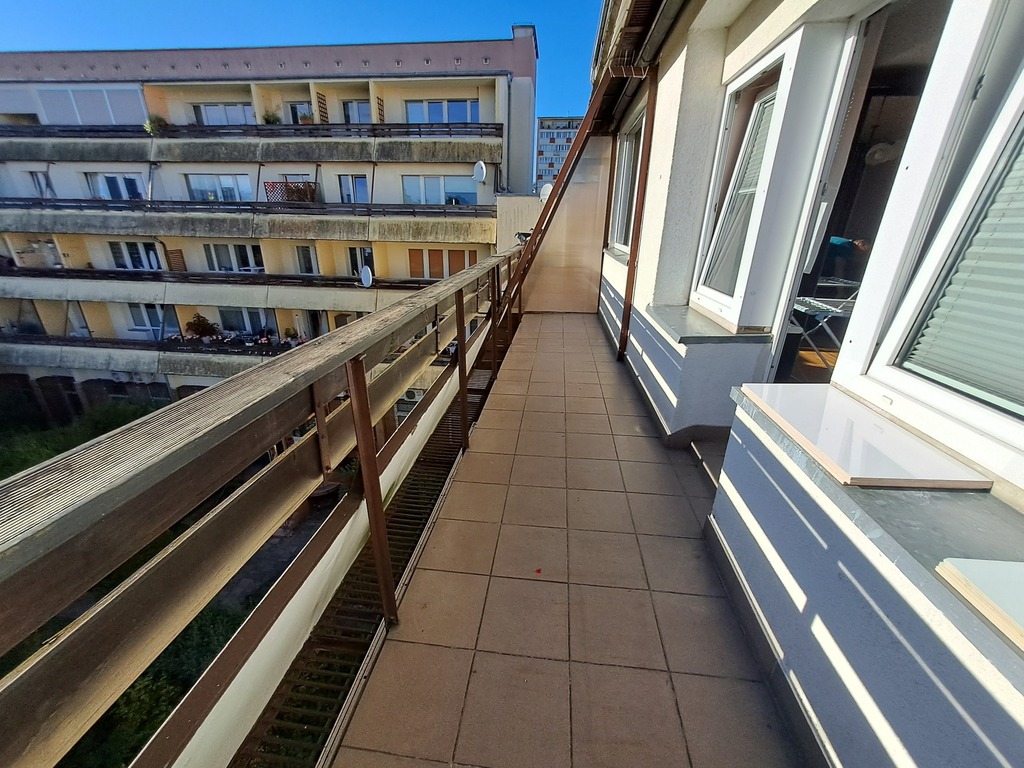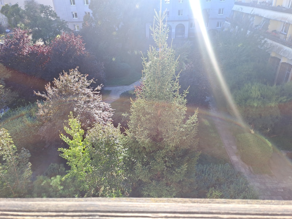 – salonu 18,5 m2 z balkonem na całej długości pokoju z widokiem na zielone podwórko od strony zachodniej,