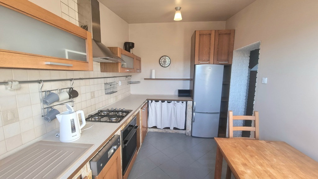 - Duża Kuchnia z Jadalnią: serce mieszkania – przestronna kuchnia w gustownej drewnianej zabudowie. Jest w pełni wyposażona w sprzęty AGD (lodówka, zmywarka, płyta gazowa, piekarnik, okap), co sprawia, że jest gotowa na przyjęcie nowego szefa kuchni.