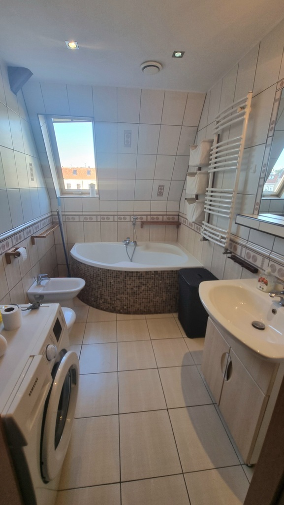 - Wykończenie: podłogi w panelach i terakocie, łazienka z narożną wanną, WC i pralką Samsung. Wysokość pomieszczeń to komfortowe od 190-300 cm.
