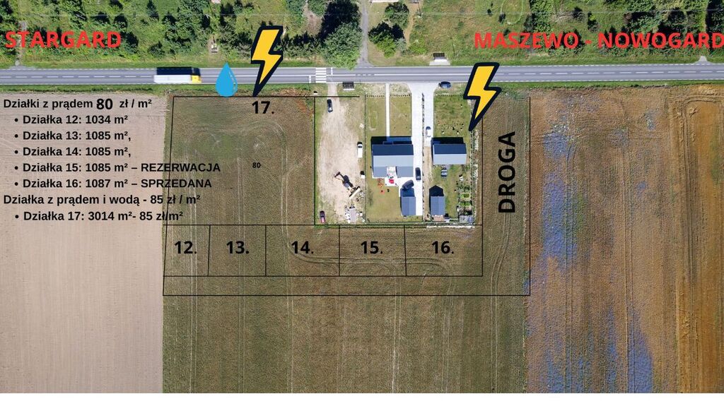 Działki z doprowadzonym PRĄDEM I WODĄ z sieci gminnej – cena 85 zł brutto /m2.