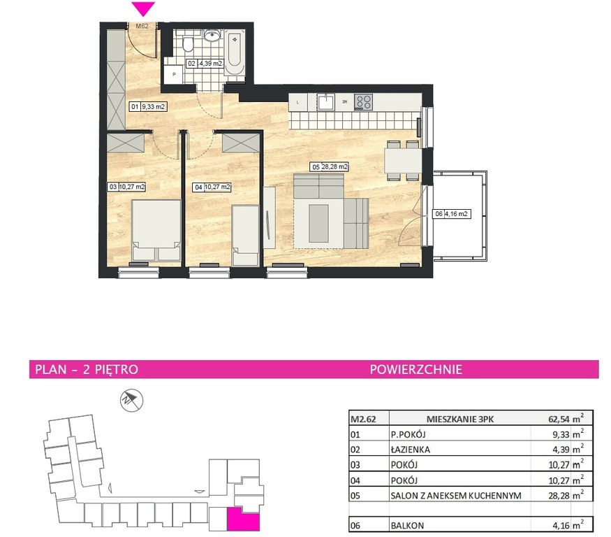 W skład powierzchni 62,54 m² wchodzą: