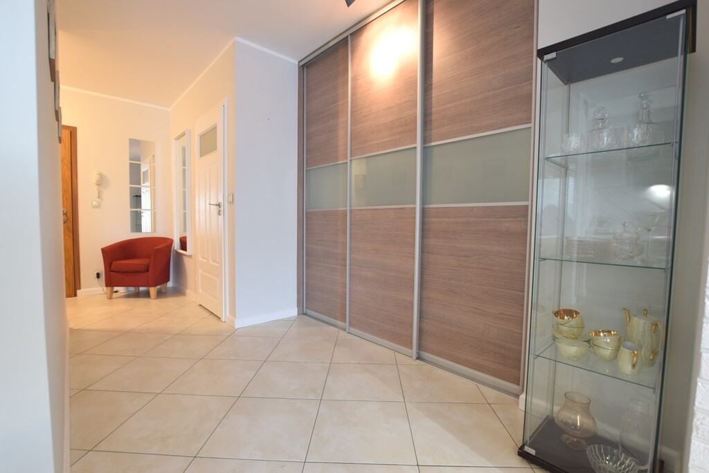 – przedpokój z dwoma bardzo dużymi szafami w zabudowie stałej ( jedna, czteroskrzydłowa, w pobliżu pokoi sypialnych służy jako garderoba/ druga, bliżej salonu, pełni funkcję – pom. gospodarczego).