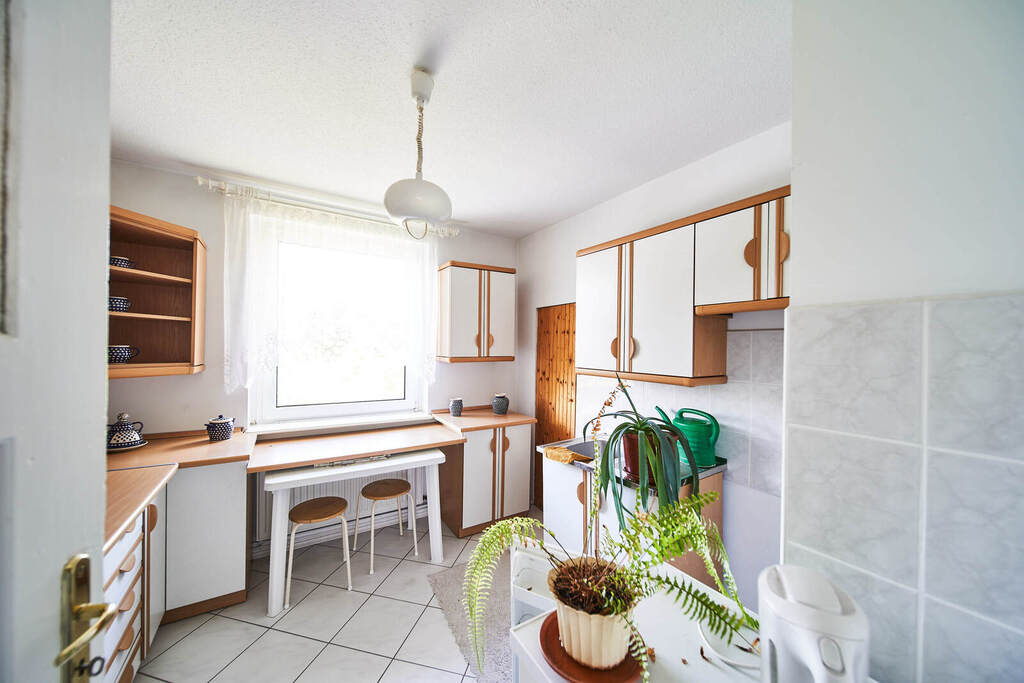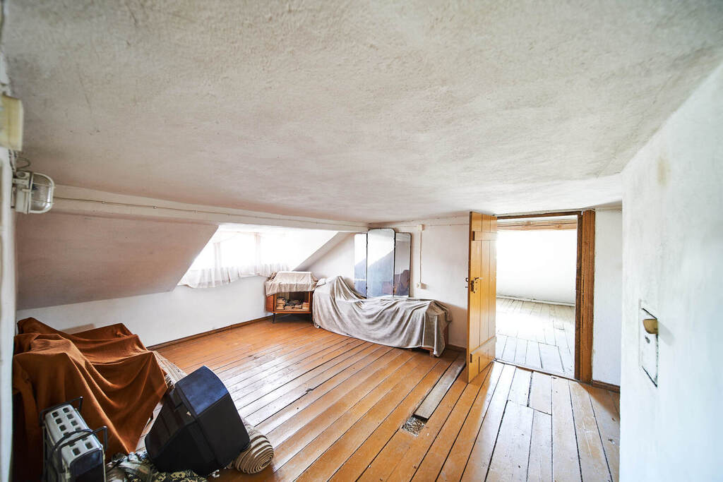 Parter domu stanowi salon ze starymi, przesuwnymi drzwiami, 3 pokoje, kuchnia ze spiżarką, łazienka z oknem i przedpokój.
