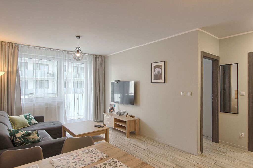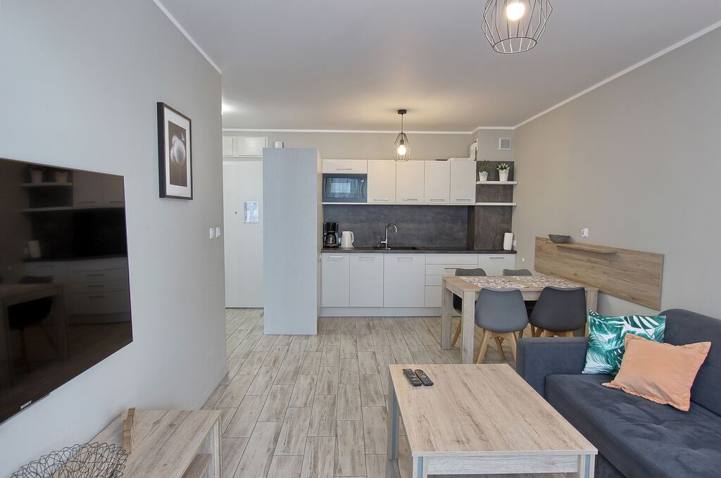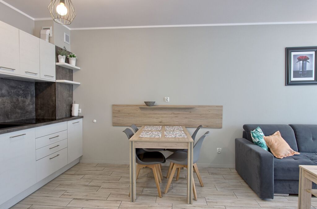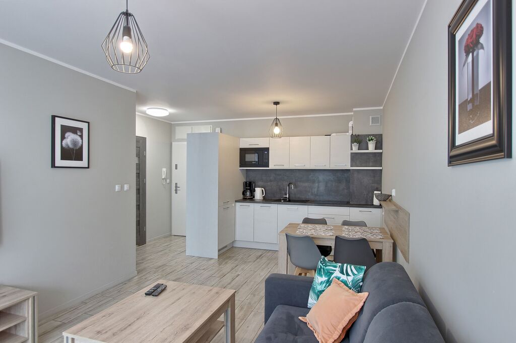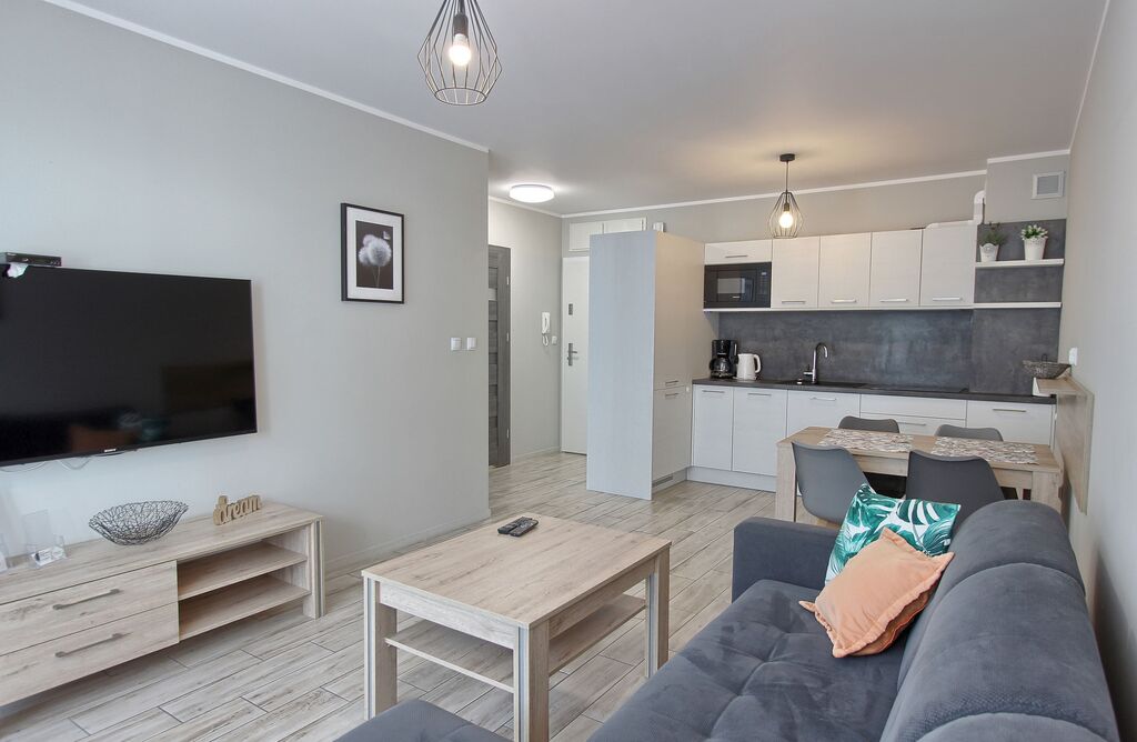 Apartament umeblowany, ładnie i wygodnie urządzony. Powierzchnia to prawie 38 m2. Składa się z salonu z rozkładaną kanapą, w pełni wyposażonego aneksu kuchennego oraz sypialni z łożem małżeńskim i łazienki z prysznicem. Dodatkowym atutem jest taras na który można wyjść z sypialni, jak i z salonu. W budynku znajduje się siłownia, rowerownia, a na dachu taras z leżakami. Teren obiektu jest ogrodzony. Budynek wybudowany przez solidnego kołobrzeskiego dewelopera, dobrze zarządzany. Koszty utrzymania to około 600 zł. Ogrzewanie i ciepła woda z sieci miejskiej.