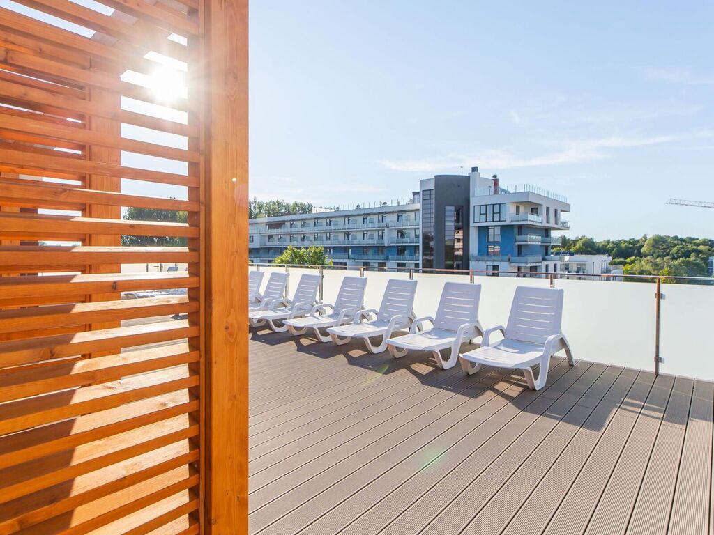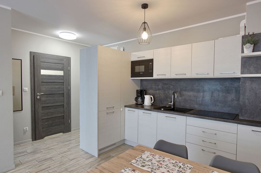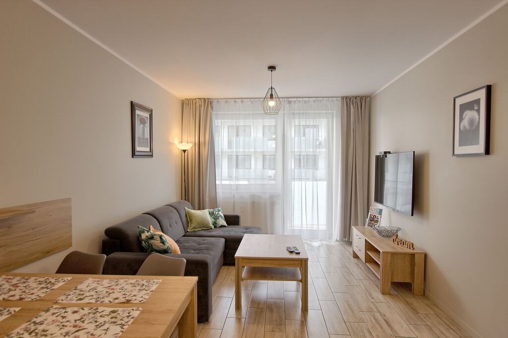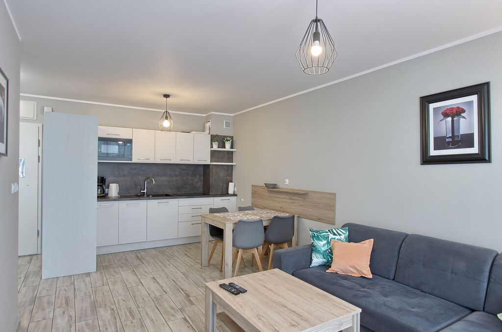 Apartament umeblowany, ładnie i wygodnie urządzony. Powierzchnia to prawie 38 m2. Składa się z salonu z rozkładaną kanapą, w pełni wyposażonego aneksu kuchennego oraz sypialni z łożem małżeńskim i łazienki z prysznicem. Dodatkowym atutem jest taras na który można wyjść z sypialni, jak i z salonu. W budynku znajduje się siłownia, rowerownia, a na dachu taras z leżakami. Teren obiektu jest ogrodzony. Budynek wybudowany przez solidnego kołobrzeskiego dewelopera, dobrze zarządzany. Koszty utrzymania to około 600 zł. Ogrzewanie i ciepła woda z sieci miejskiej.
