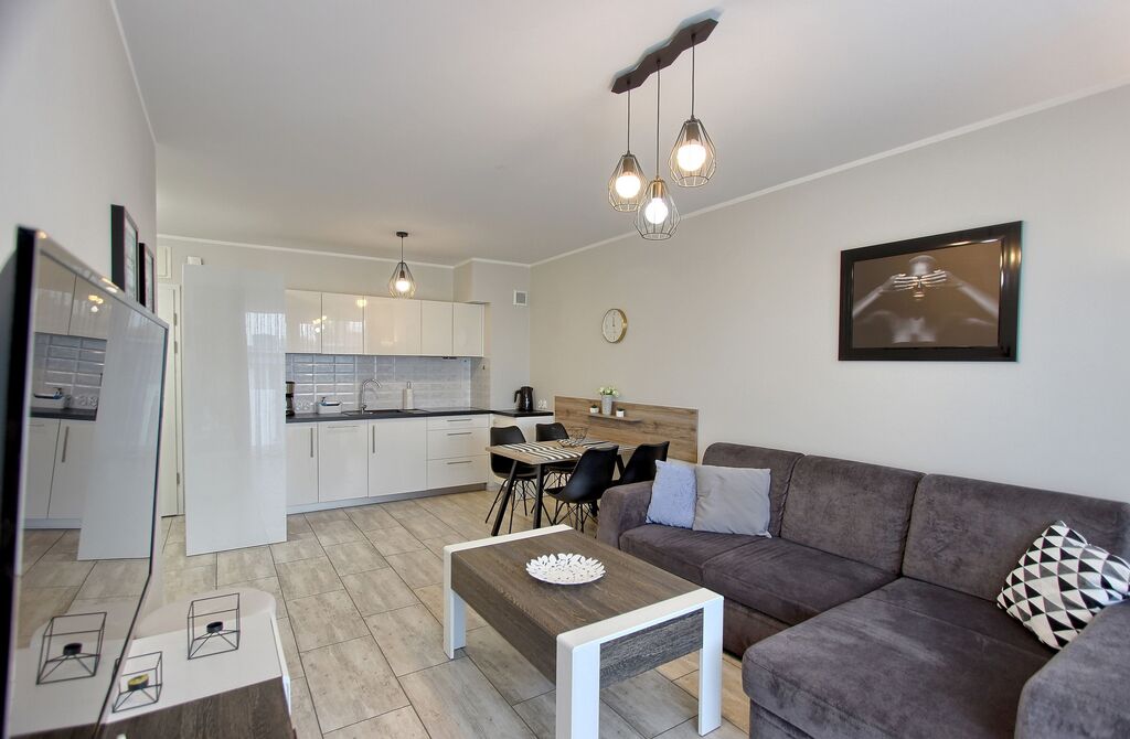 Apartament umeblowany, ładnie i wygodnie urządzony. Powierzchnia to prawie 38 m2. Składa się z salonu z rozkładaną kanapą, w pełni wyposażonego aneksu kuchennego oraz sypialni z łożem małżeńskim i łazienki z prysznicem. Dodatkowym atutem jest taras na który można wyjść z sypialni, jak i z salonu. W budynku znajduje się siłownia, rowerownia, a na dachu taras z leżakami. Teren obiektu jest ogrodzony. Budynek wybudowany przez solidnego kołobrzeskiego dewelopera, dobrze zarządzany. Koszty utrzymania to około 600 zł. Ogrzewanie i ciepła woda z sieci miejskiej.