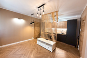 - Eleganckie kafle w salonie ułożone w układzie jodełki; ogrzewanie podłogowe z mat grzewczych dla maksymalnego komfortu.