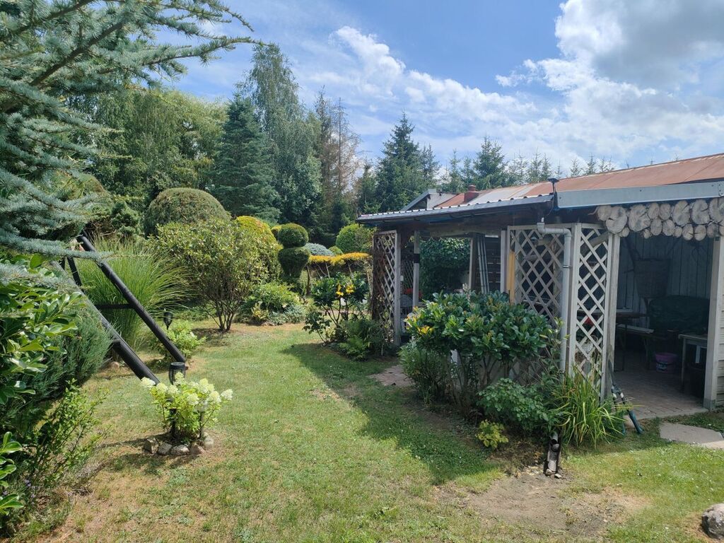Obecnie na działce znajduje się domek letniskowy z tarasem i pomieszczeniem gospodarczym.