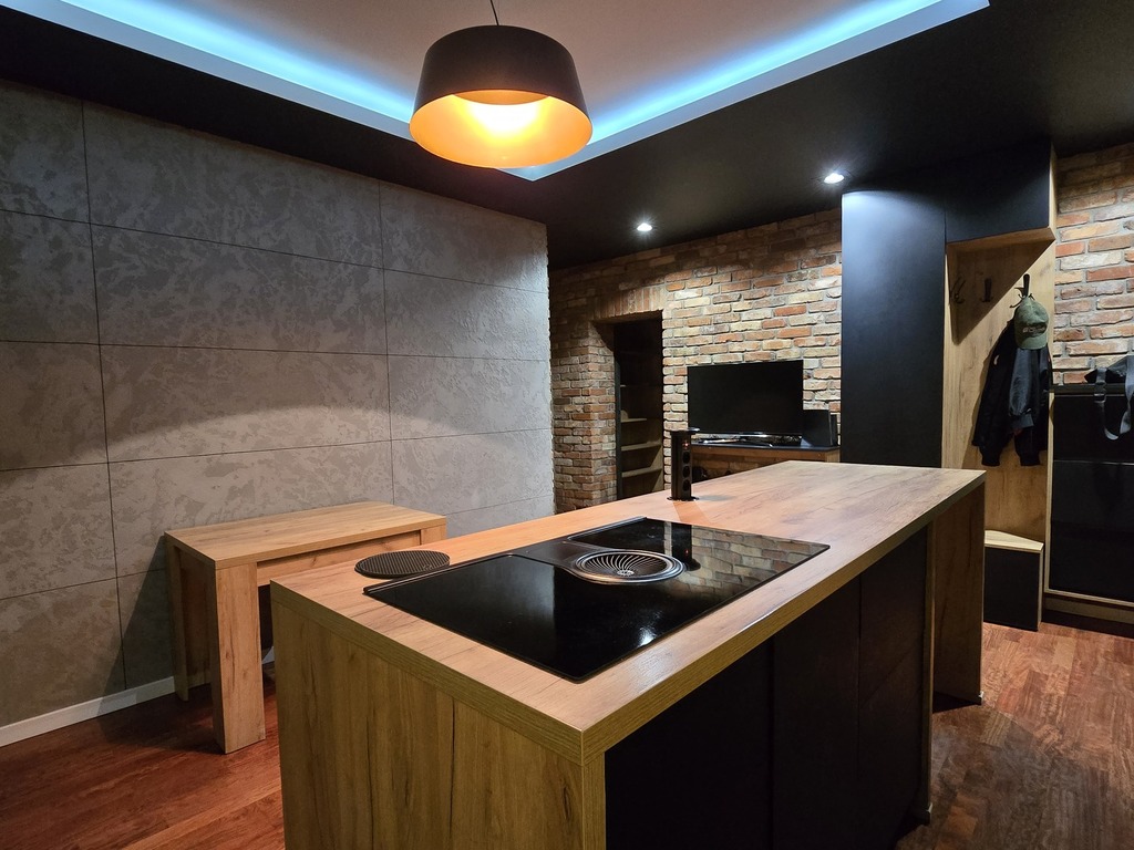 - Nowoczesna kuchnia z meblami na wymiar, wyspą kuchenną oraz pełnym wyposażeniem (płyta indukcyjna na siłę TESLA, piekarnik, zmywarka, lodówka)