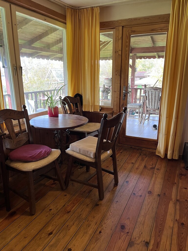 • Drewniany dom całoroczny o dwóch kondygnacjach, w pełni wyposażony i podpiwniczony: