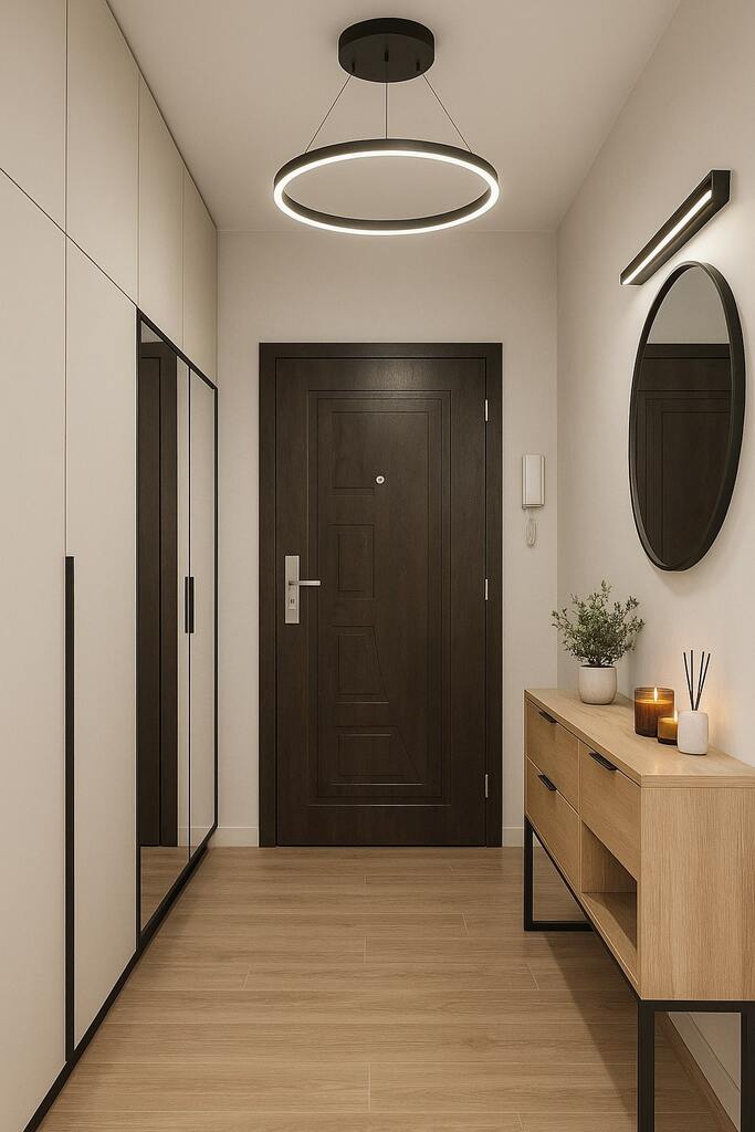 duży, przestronny korytarz z miejscem na szafy w zabudowie.