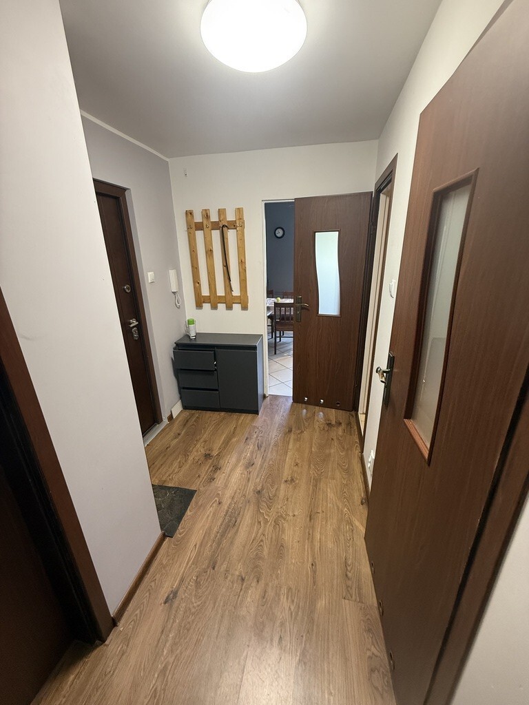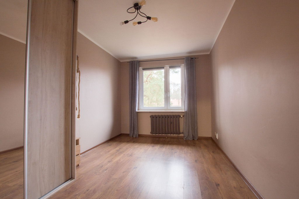 Sypialnia (ok. 13 m²): Kompaktowa, ale funkcjonalna – z wbudowaną szafą z drzwiami przesuwnymi (z lustrem dla optycznego powiększenia), stolikiem nocnym i dużą szafą wnękową na ubrania. Podłoga w panelach, ściany w neutralnym beżu – idealna na relaksujący kącik wypoczynkowy.