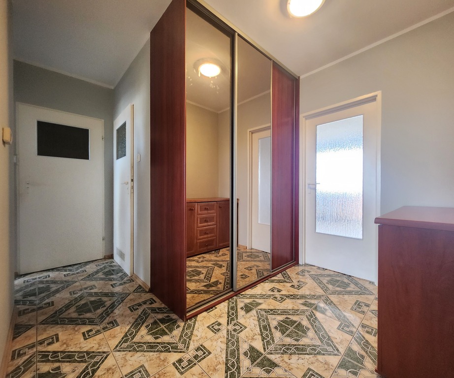 Mieszkanie o funkcjonalnym rozkładzie pomieszczeń. W korytarzu duża szafa w zabudowie.