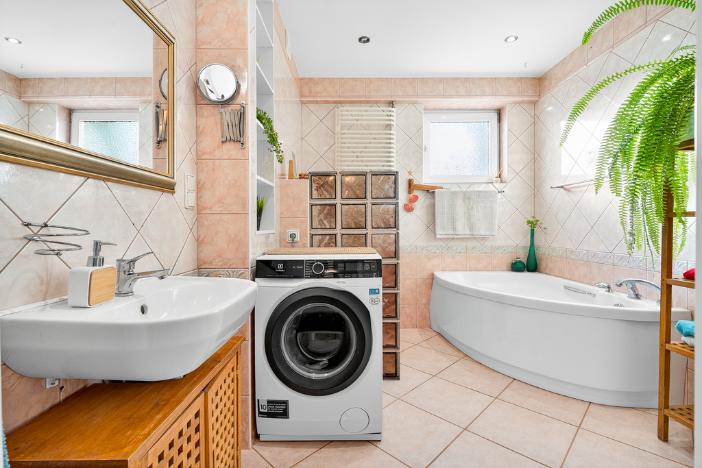 - łazienka z wanną, WC i kabiną prysznicową: 7,5 m²