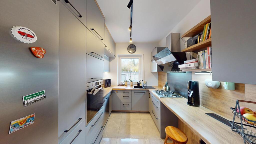 – oddzielna kuchnia z piękną, nowoczesną zabudową na wymiar aż do sufitu,