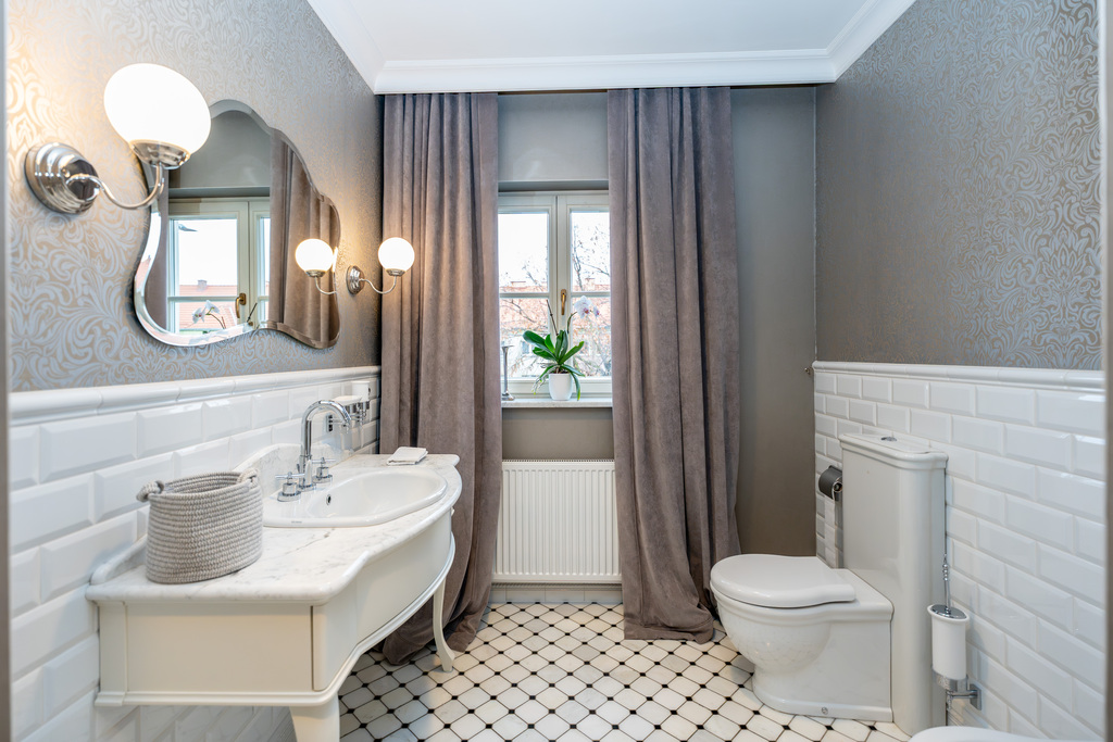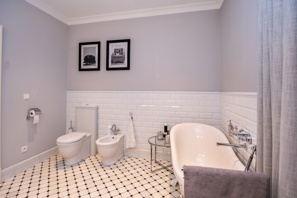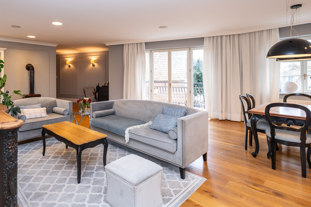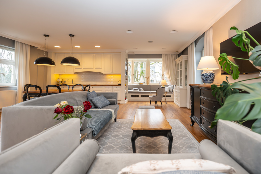 To wnętrze, które zachwyca dbałością o detal i ponadczasową klasą. Dominuje piękna, olejowana deska dębowa na podłogach, wysokie listwy przypodłogowe, sztukaterie ścienne i sufitowe, klasyczne proporcje pomieszczeń. Szaro-beżowa paleta barw przełamana głęboką zielenią i czernią, welurowe sofy, żyrandole w stylu glamour, kominek wolnostojący w salonie. Kuchnia otwarta na jadalnię w bieli i drewnie,. Łazienki wykończone marmurem i mozaiką w stylu retro (wanna wolnostojąca na lwich łapach, baterie w chromie).